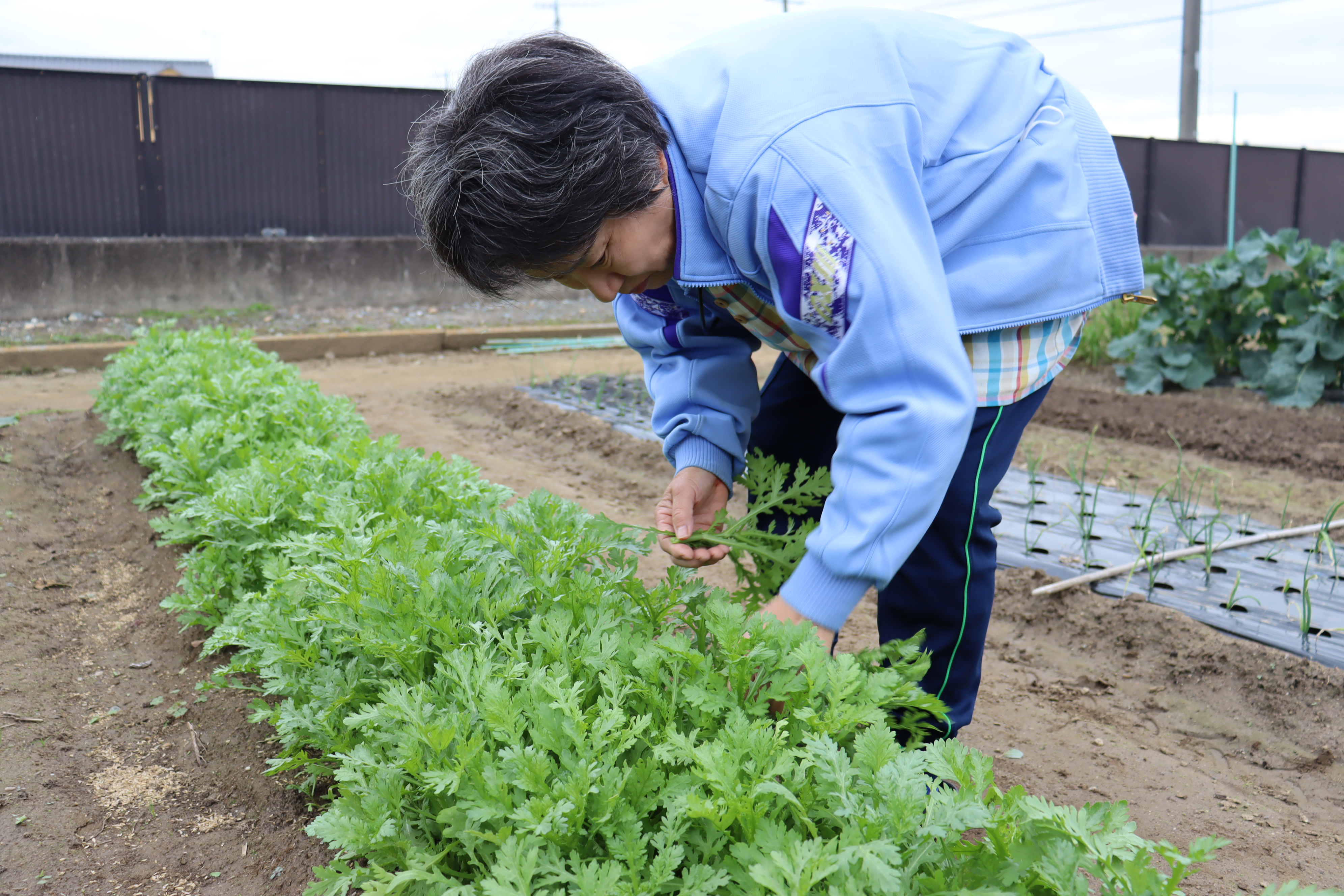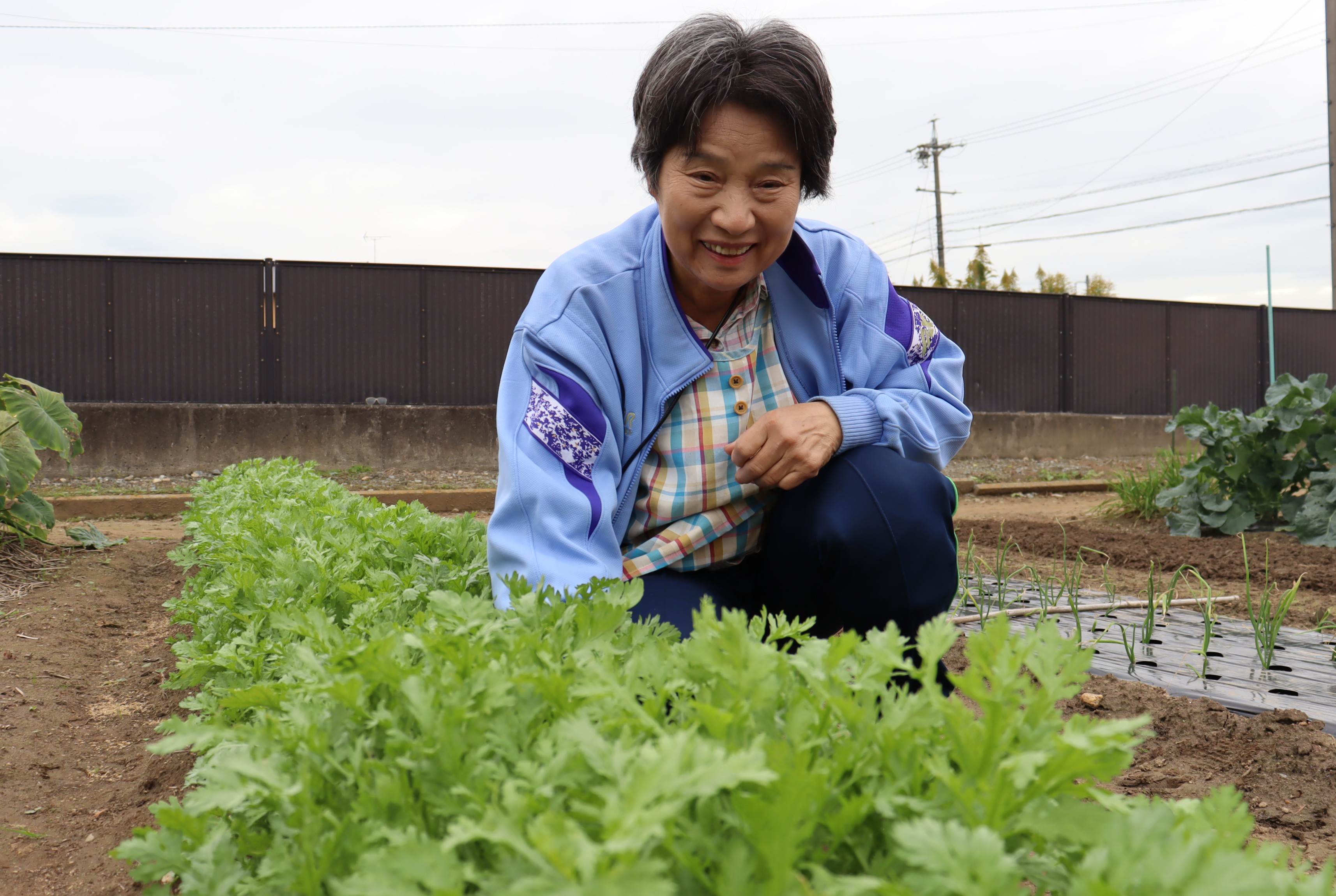 津市一色町で年間30品目以上の野菜や花を生産する田中清子さん。約10アールの圃場でシュンギク、モロヘイヤ、ラディッシュなど季節ごとの野菜を、夫の正行さんと一緒に栽培しています。JA津安芸農産物産直