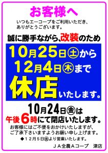誠に勝手ながら、改装のため 10月25日(土)から12月4日(木)まで休店いたします。