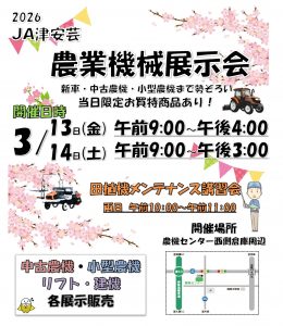 3/13(金)・14(土)農業機械展示会を開催します!