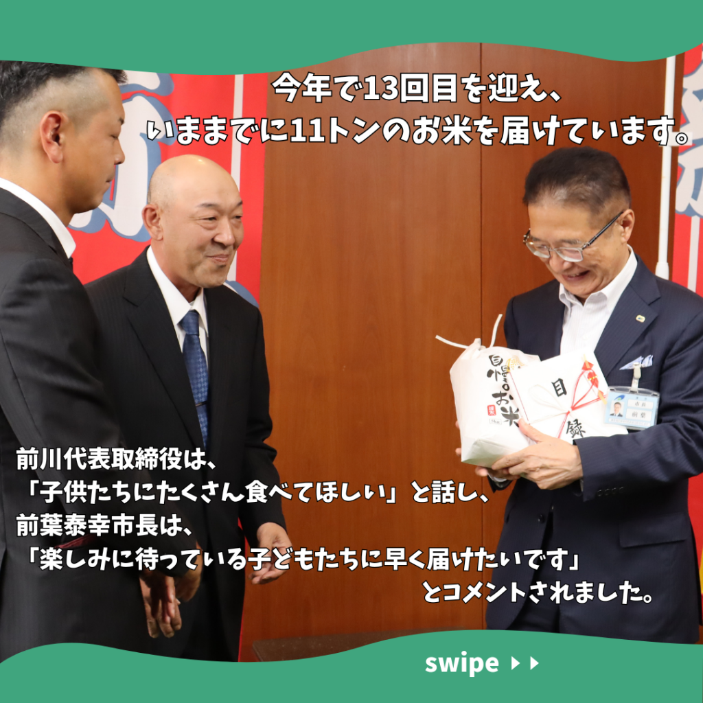 この取り組みは2014年から続けられていて、なんと今年で13回目!これまでに11トンものお米が寄贈され、市を通じて市内の児童養護施設に届けられています🍚💛