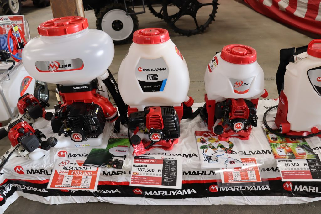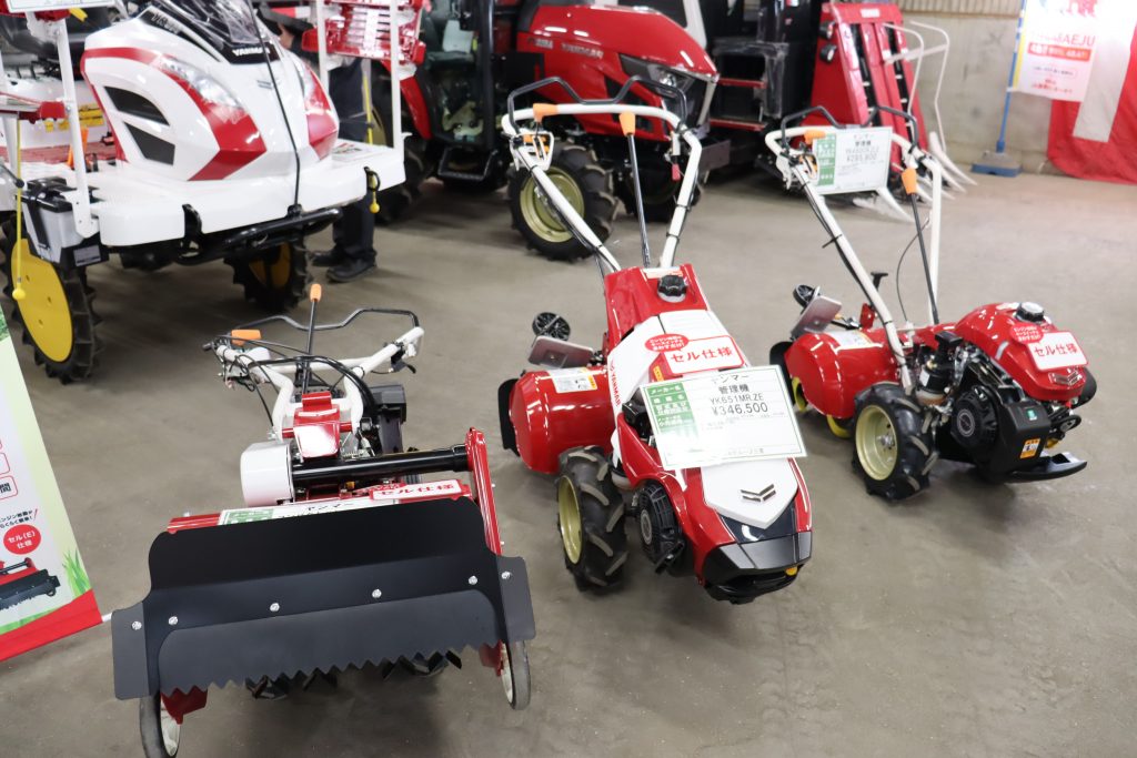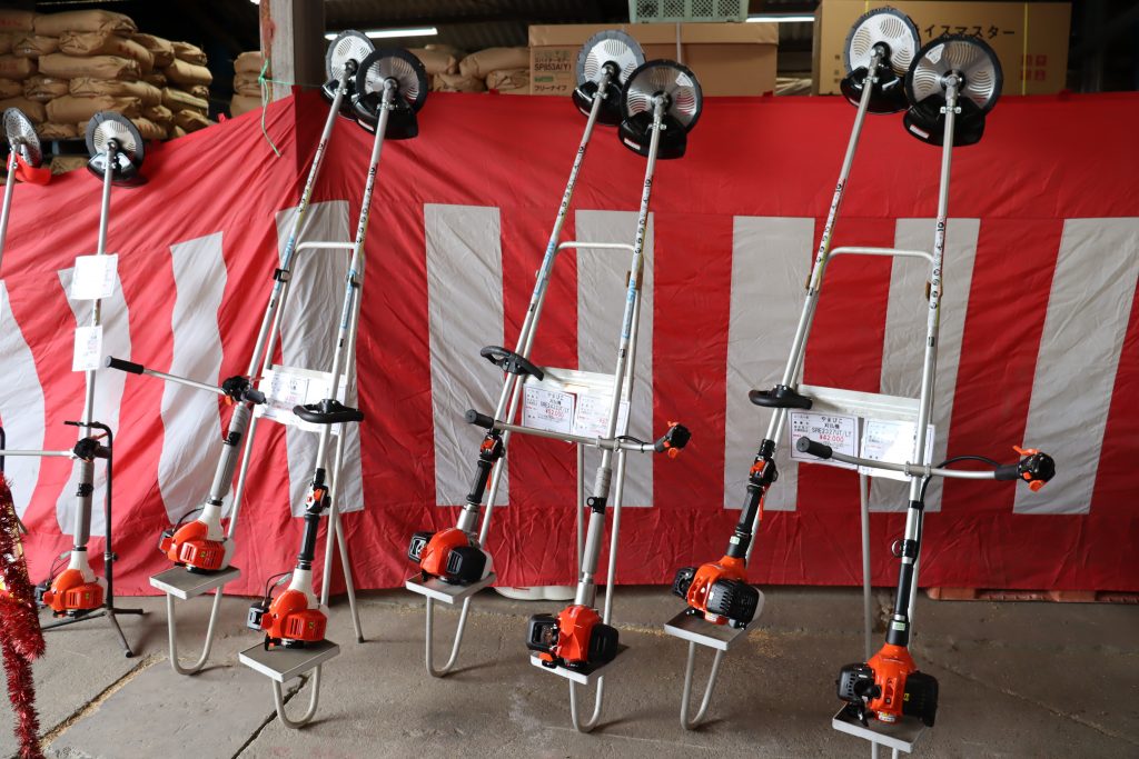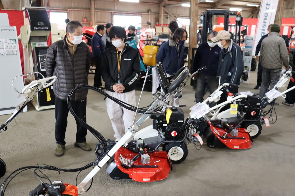会場では、台数限定の刈払機や小型管理機が注目を集め、来場者は農機担当職員やメーカー担当者から商品の説明を受けながら性能を確かめていました。
